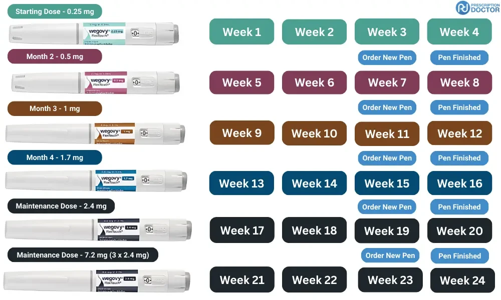 Wegovy has two main maintenance doses, 2.4 mg or 7.2 mg per week. However, some individuals choose to remain at the lower 1.7 mg strength. If you experience side effects or find that your current pen is effective for weight loss, you can discuss maintaining it rather than titrating up with your clinician.